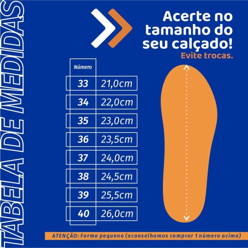 Atenção: A forma da sapatilha é pequena, favor observar a tabela de medidas no anúncio. Aconselhamos a comprar 1 número maior que o habitual.