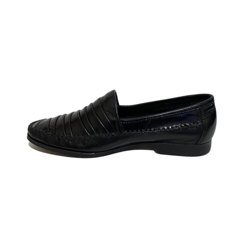 Sapato maculino mocassim, confeccionado em material sintético envernizado, sem fivela, sola emborrachada e bico redondo.